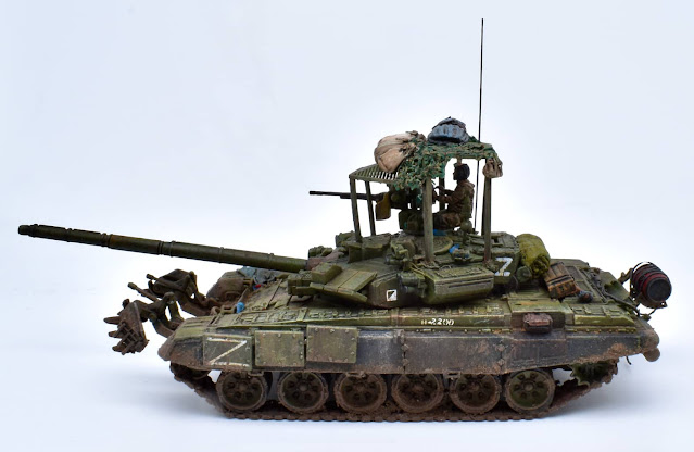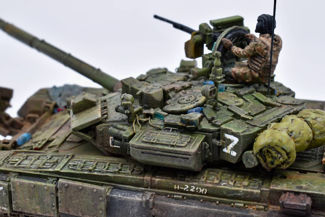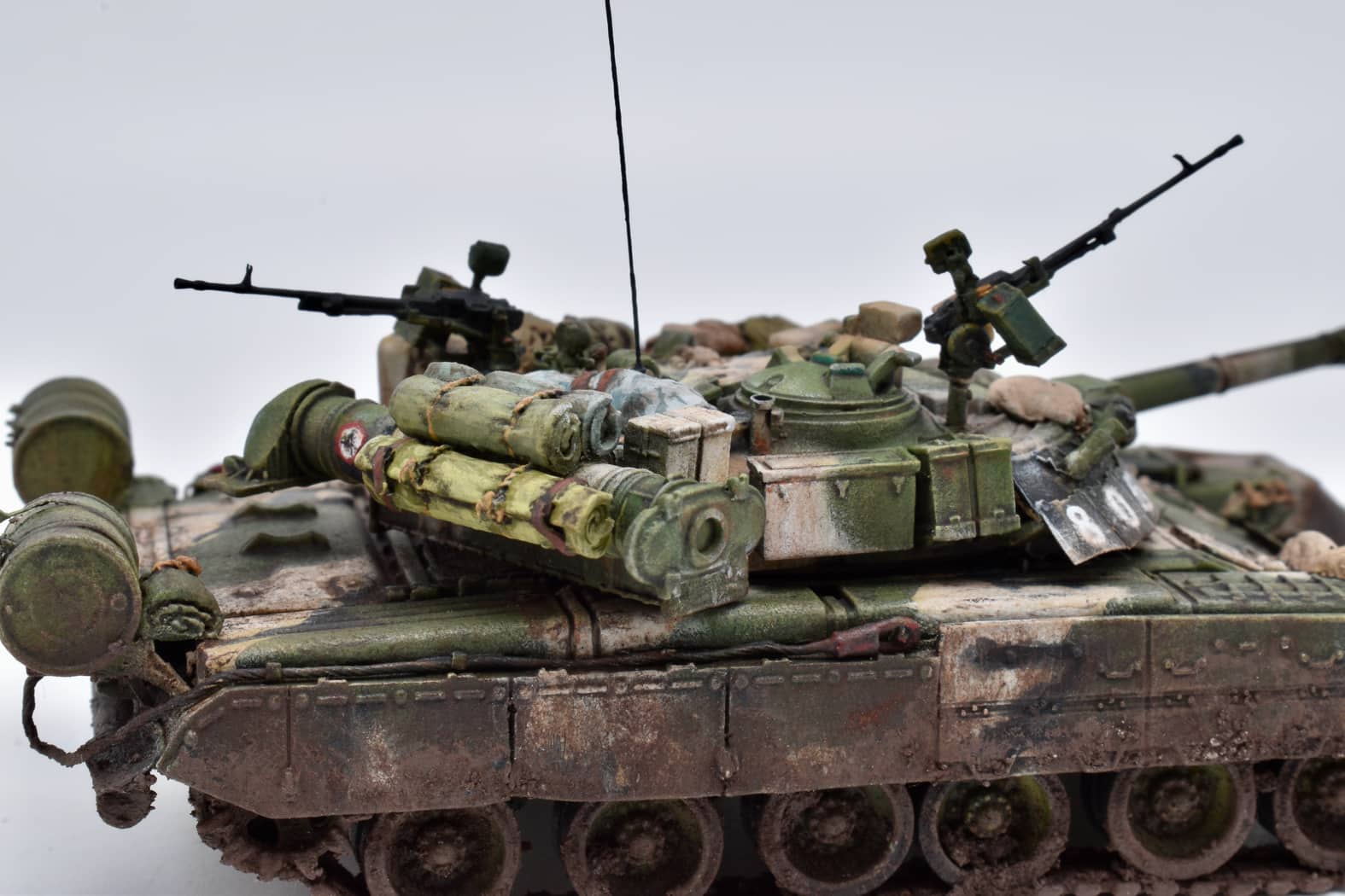 One of my favorite Soviet/Russian tank, I tried for a long time to get the T-80U kit from Modelcollect and, when I finally got it, I had to wait a long time before finding the time to tackle it. This kit is certainly a very good base but leaves the door open to improvements and modifications. I finally improved the rear generator and the fuel arrival, remade the wiring on the turret, replaced the Luna projector by a thermal system, added the supports for the external machine gun, replaced the awful NSVT from the kit by 2 copies from Best Resins, replaced the auxiliary tanks and the smoke dischargers by those from SG-Modelling, added the towing cables and their ties. I am very satisfied with the result and the 3 tones camo painting tired by a winter in the field.